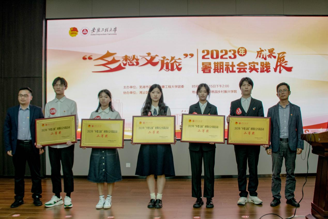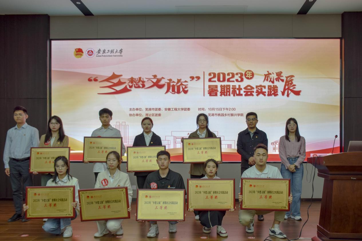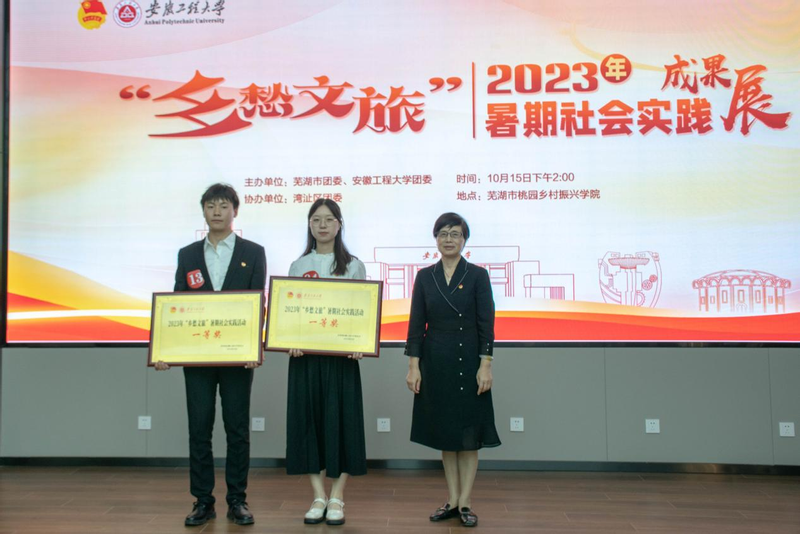 本网讯10月15日,校团委在湾沚区桃园乡村振兴学院举办2023年“乡愁文旅”暑期社会实践活动成果展示活动。校党委副书记苏国红,团市委副书记李小东,湾沚区团委、南陵县团委、繁昌区团委负责人出席活动并担任评委。校团委负责人以及各学院党委副书记、团委负责人,16个学生实践团队代表参加活动。经现场布展和成果评比,纺织服装学院“画小匠”墙绘实践团队、设计学院“欣新乡见”调研团队获得一等奖,外国语学院陶辛镇乡村振兴社会实践团等5个团队获得二等奖,电气工程学院(集成电路学院)“家电维修进万家”团队等9个团队获得三等奖。