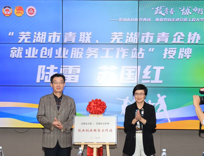 陆雷、苏国红共同为“芜湖市青联、芜湖市青企协就业创业服务工作站”揭牌。