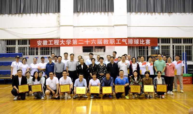 本网讯10月25日至11月1日,由校工会、体育学院主办的第二十六届教职工气排球比赛在体育馆举行。历时6天44场激烈角逐,后勤代表队摘得桂冠,机关代表队和外国语学院代表队分获亚军和季军,化学与环境工程学院代表队、材料科学与工程学院代表队、机械工程学院代表队、电气工程学院代表队、纺织服装学院代表队分获第四至第八名,马克思主义学院代表队和教辅代表队荣获体育道德风尚奖。赛后,举行了颁奖仪式,校党委副书记苏国红,主办单位负责人为各优胜队颁奖。