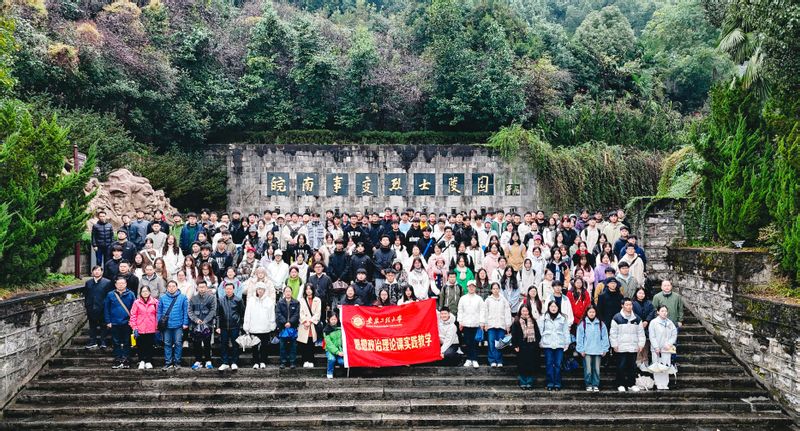 实践教学第一站,皖南事变烈士陵园。皖南事变烈士陵园位于泾县水西山,是1990年初为纪念皖南事变新四军将士殉难五十周年而修建。在讲解员的悉心讲解和带领下,老师和学生们参观纪念碑、纪念廊、无名烈士墓,了解了许多革命烈士事迹,感悟革命精神。随后献上花圈以缅怀先烈。