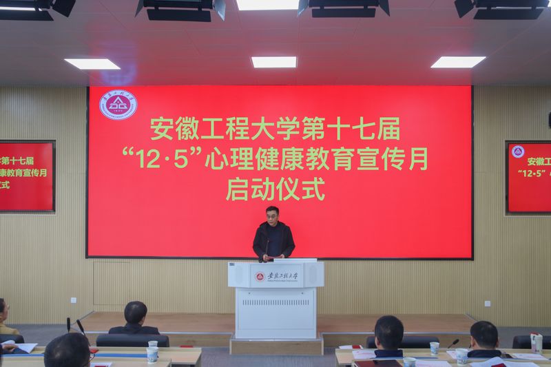 本网讯11月22日,校第十七届“12·5”心理健康教育宣传月启动仪式在5J217报告厅举行。本届心理健康教育宣传月主题为“青春心向阳,奋进新征程”,由心理健康教育中心、学生处、研究生工作部共同主办。校党委常委、副校长郑健出席启动仪式并讲话,芜湖市第四人民医院主任医师夏仲受邀参加启动仪式并作专题讲座。相关部门负责人、各学院分管书记、专兼职心理咨询师、心理联络员、辅导员代表和学生代表200余人参加活动,启动仪式由心理健康教育中心主任金艾裙主持。