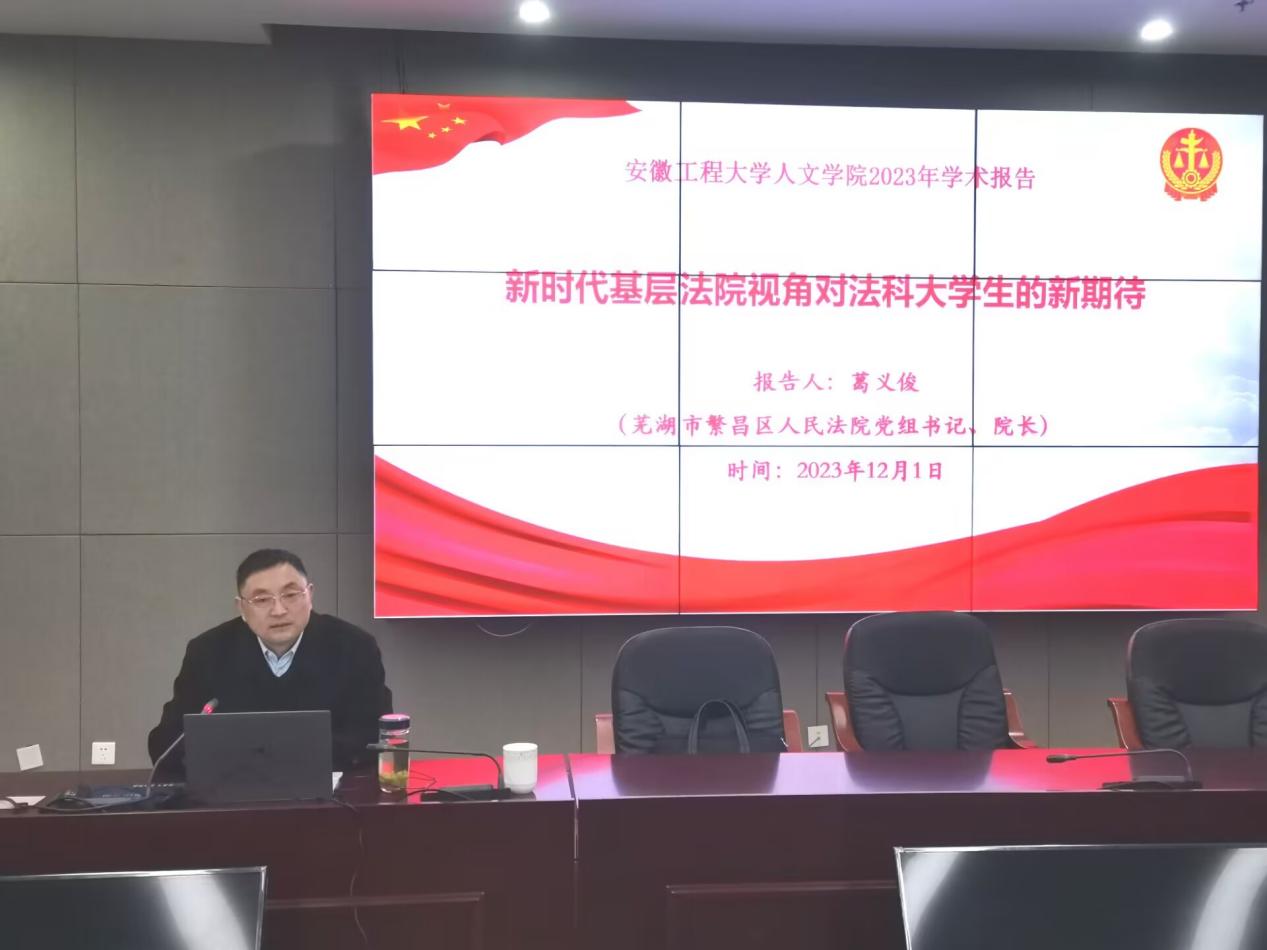 本网讯12月1日,人文学院法学系在图书馆综合楼201会议室举行司法理论与实务专题学术报告会,报告会邀请了芜湖市繁昌区人民法院党组书记、院长葛义俊作学术报告,法学专业2020级本科生、部分研究生聆听了报告。