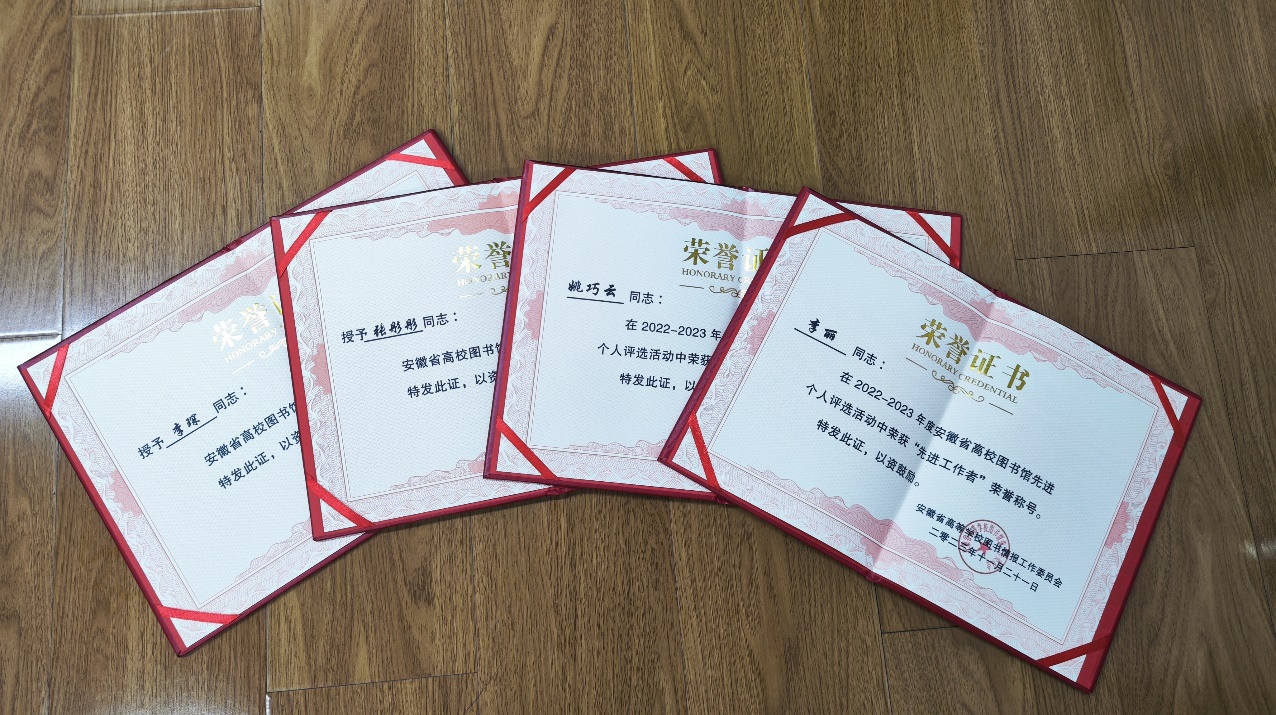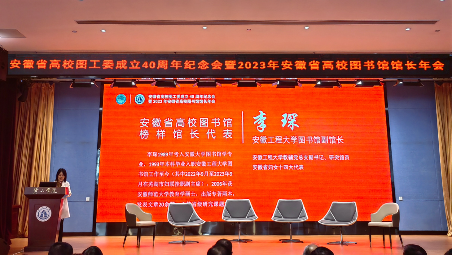 本网讯 11月30日至12月2日,由安徽省高等学校图书情报工作委员会主办、黄山学院图书馆承办的安徽省高校图工委成立40周年纪念会暨2023年安徽省高校图书馆馆长年会在黄山学院召开。我校图书馆获“2022至2023年度先进集体”荣誉称号,李琛副馆长获“榜样馆长”荣誉称号并在会上作交流发言。张彤彤,李丽、姚巧云分别荣获“榜样馆员”和“先进工作者” 荣誉称号。