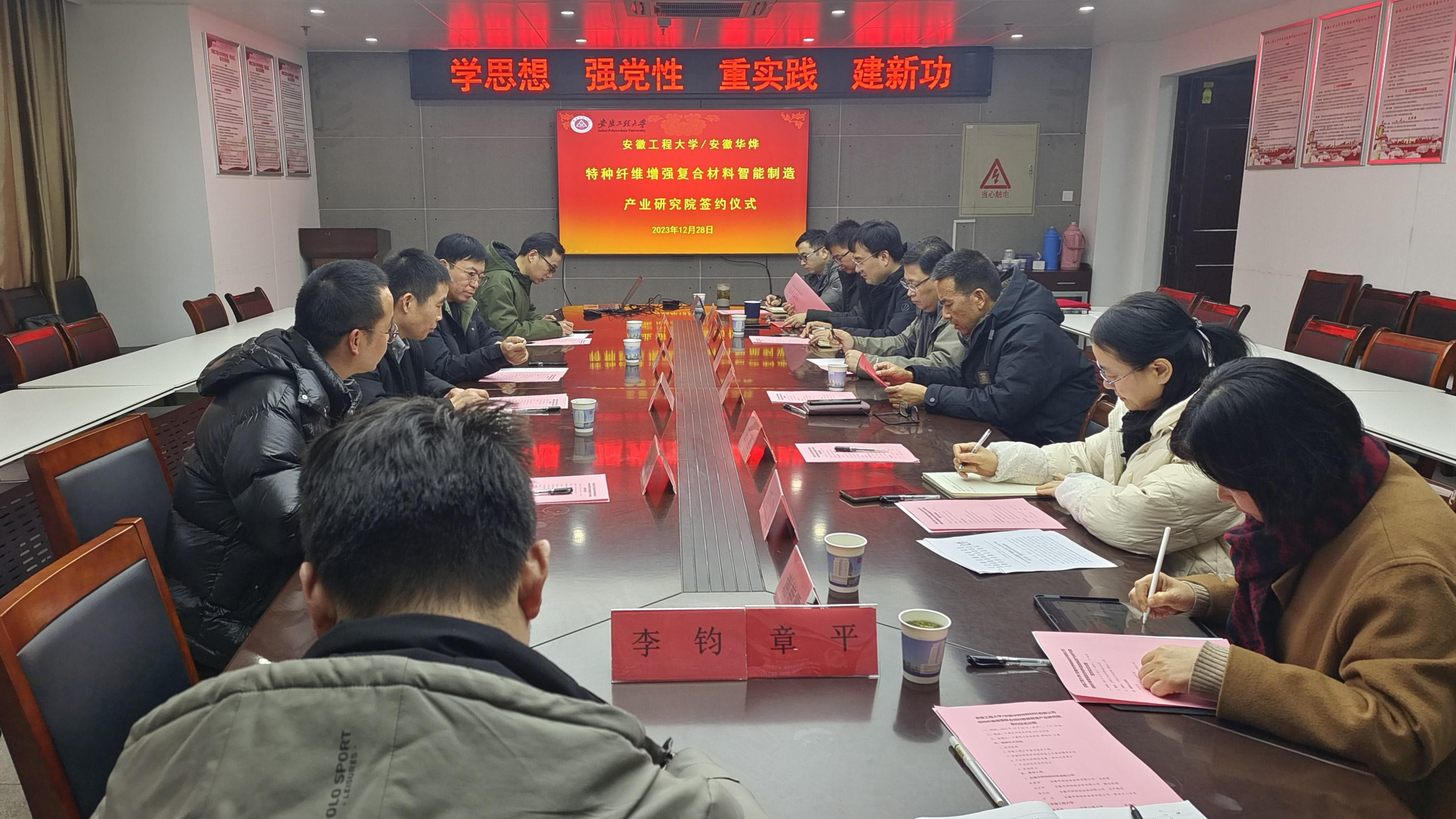 本网讯12月28日,学校与安徽华烨特种材料有限公司(以下简称安徽华烨)共建的特种纤维增强复合材料智能制造产业研究院签约仪式在计算机与信息学院会议室举行。学校副校长高彦峰,安徽华烨总经理朱泽贺出席了此次活动。学校相关部门、计算机与信息学院、纺织服装学院有关负责人以及部分专业教师参加了本次活动。活动由计算机与信息学院副院长王勇主持。