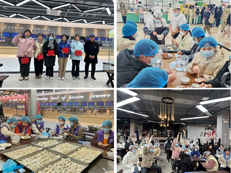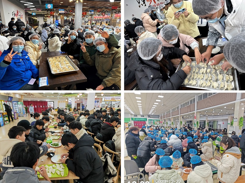 “烹”享快乐,冬至不寒冷。为弘扬中华民族传统文化,丰富学生的校园生活,冬至期间,在学生伙食管理委员会精心策划下,分组分批安排了500多名学生前往各食堂开展包饺子实践教育活动,各食堂积极响应,免费提供原材料,食堂师傅们手把手教学,同学们积极动手参与,提升了活动的体验感和获得感,活动中还设置了有奖竞赛环节,现场充满欢声笑语,其乐融融。当盘子里摆满了造型新颖的饺子,当一屉屉热气腾腾的饺子端上桌,同学们与食堂工作人员一起品尝劳动成果,共享美好“食”光。主动参与,亲手体验,让学生们体会到烹饪的快乐与充实,收获烹饪知识的同时,对中国传统文化有了进一步的理解。近期,食堂还积极协助体育学院、数金学院开展包饺子劳动体验活动。