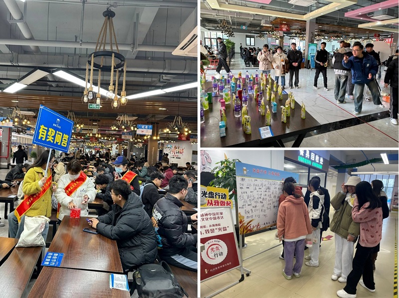光盘行动,文明新“食”尚。后勤高度重视制止餐饮浪费工作,认真贯彻落实习近平总书记关于制止餐饮浪费行为的重要指示精神,要求各食堂通过悬挂张贴“光盘行动,从我做起”、“珍惜粮食,反对浪费”文明提示标语,播放主题宣传片等,常态化开展相关主题的宣传教育活动,多种途径营造“节约为荣、反对浪费”的良好氛围,积极引导全校师生树立勤俭节约的意识。二食堂、四食堂和东区食堂纷纷举办了“光盘签名墙”“光盘送水果”“光盘有奖问答”“光盘套圈”等活动,大家兴趣盎然、踊跃参加,人人争当“光盘卫士”,人人争做“节约能手”,对浪费粮食说“不”,在宣传“厉行节约 反对浪费”理念的同时,树立了校园文明就餐新“食”尚。