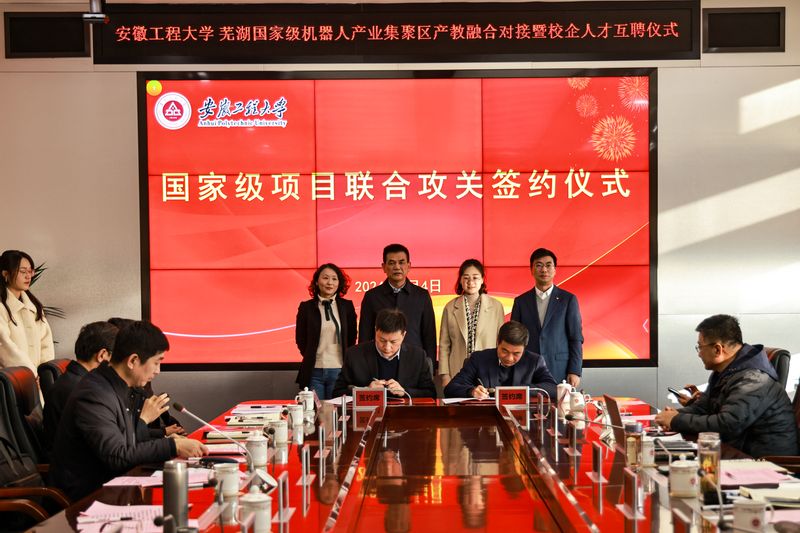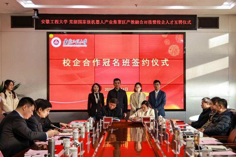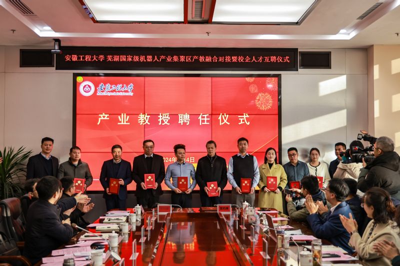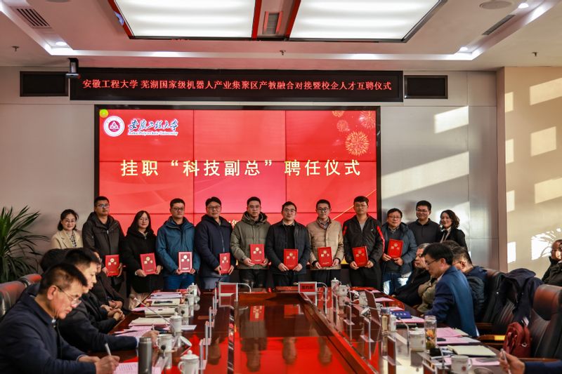 学校办公室、人事处、社会合作处、教务处、科技处、人工智能学院负责人,青年教师代表,鸠江区发改委负责人及芜湖国家级机器人产业集聚区24位企业负责人参加了仪式。
