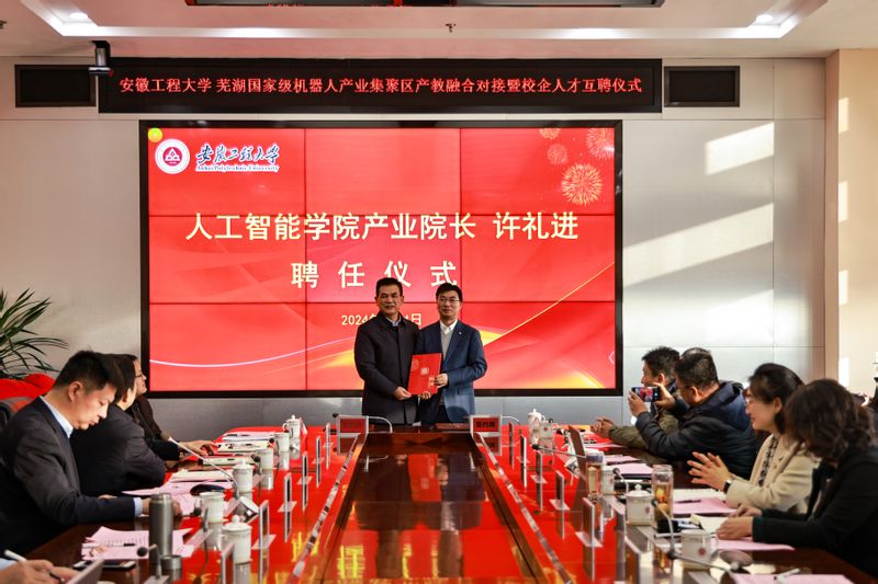 仪式上,卢平、凤权为受聘人工智能学院产业教授的园区企业负责人颁发了聘书,梁燕、沈燕为受聘园区企业挂职“科技副总”的10名博士颁发了聘书。人工智能学院党委书记任家钱介绍了学院的师资队伍、学科专业、科研平台、教学资源等情况,许礼进重点介绍了国家芜湖机器人产业集聚区基本情况及入驻企业发展现状。校企双方代表分别签署了合作协议。与会人员围绕校地校企合作和产教融合发展进行了交流讨论。