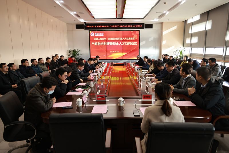 本网讯1月4日,学校与芜湖国家级机器人产业集聚区产教融合对接暨校企人才互聘仪式在国际工程师学院图文信息中心701会议室举行。校党委副书记、校长卢平,校党委常委、副校长凤权,鸠江区委副书记梁燕,芜湖市科技局副局长沈燕,芜湖机器人产业发展集团有限公司董事长、总经理许礼进出席仪式。仪式由凤权主持。