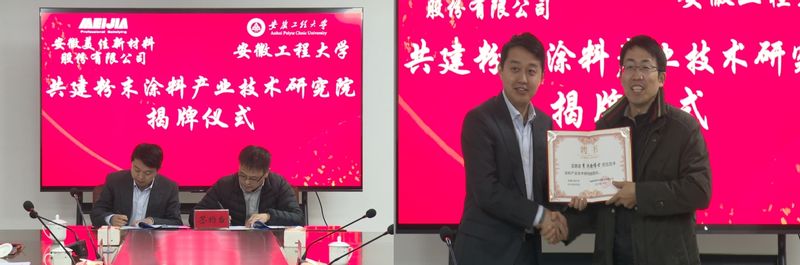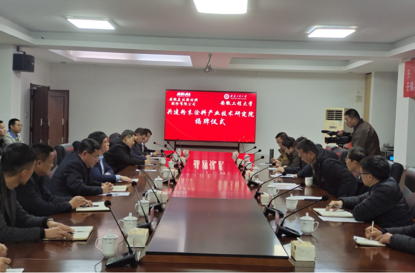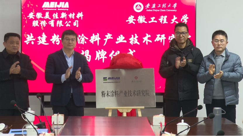 本网讯1月5日,学校与安徽美佳新材料股份有限公司共建的“粉末涂料产业技术研究院”揭牌。学校副校长高彦峰,繁昌区委书记瞿辉、芜湖市科技局副局长安康、繁昌区管委会主任高翔、繁昌区副区长华光、繁昌区经信局局长赵福、繁昌区科技局局长陈守峰,美佳新材料董事长王方银、总经理王鹏出席本次活动。校社会合作处、科技处、化学与环境工程学院相关负责人,美佳新材料主要部门负责人参加活动。