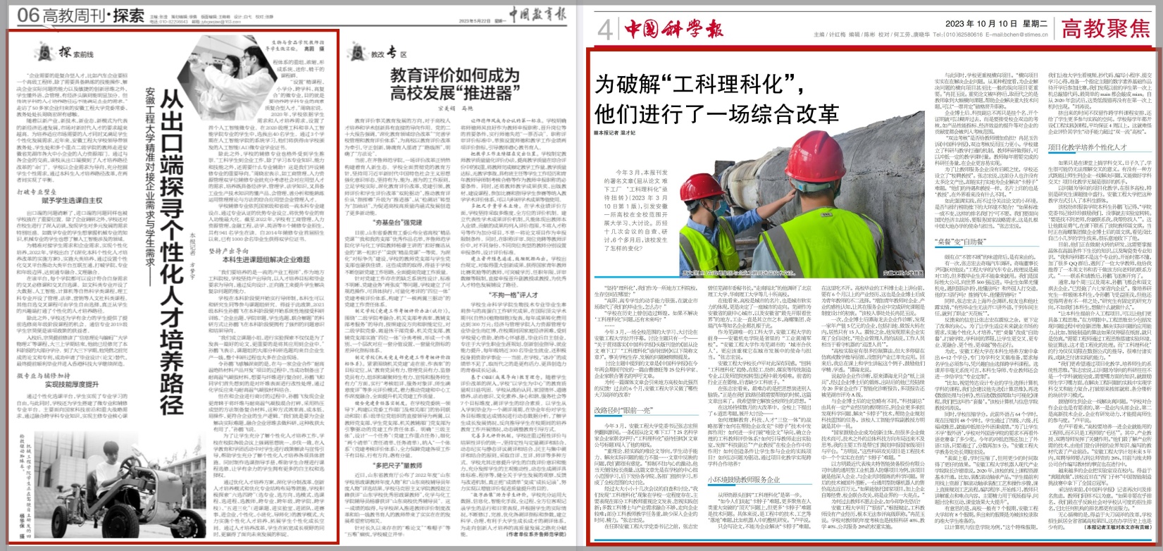 8.实施个性化人才培养方案,打出教学改革“组合拳”。学校持续深化个性化人才培养改革,学生对此项改革的总体满意度高达94.46%,《中国教育报》《中国科学报》、教育部教育质量评估中心对此大篇幅专题报道。“一样的分数、不一样的教育”,得到了考生及家长的一致认可,2023年我校省内理科录取线高出一本线38分,位居省属高校前列。持续提升专业内涵,获批国家级一流课程3门、教师教学竞赛国家级特等奖1项、一等奖3项,通过工程教育专业认证2个,新文科教育专业认证4个。主动优化学科专业结构,服务安徽产业创新发展,近80%的专业与安徽省十大新兴产业对接,学校在全省高校学科专业改革座谈会上作经验交流。