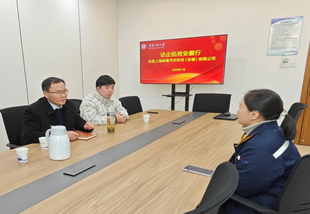 本网讯为进一步深化校企合作,拓宽毕业生就业渠道,1月23日,机械工程学院党委副书记秦广虎带队走进合肥经开区,参观上海保隆汽车科技(安徽)有限公司和中国化学工程第三建设有限公司,并开展座谈交流。