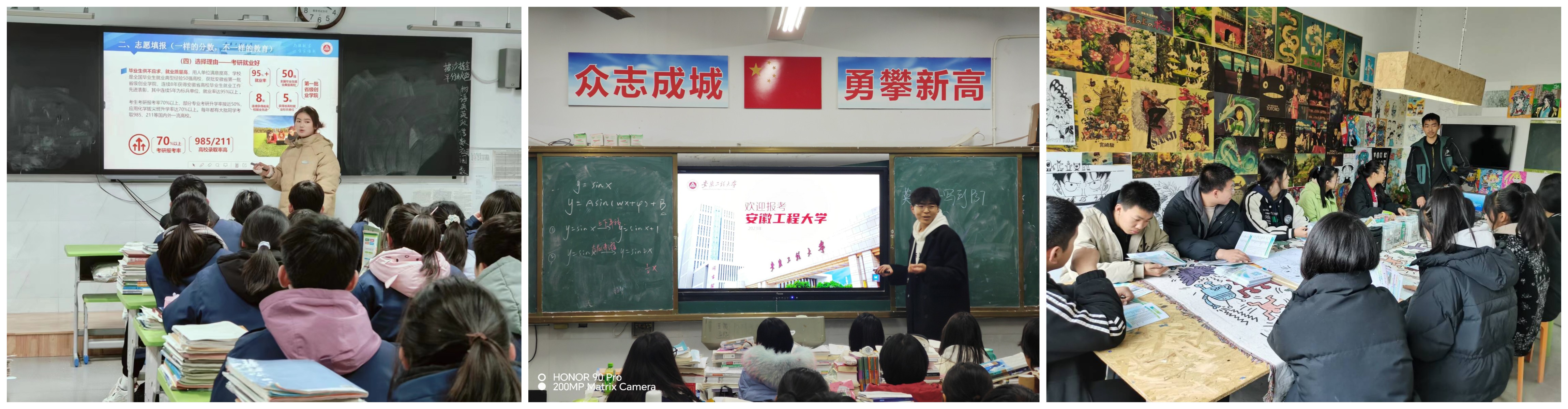 设计学院组织多支招生宣传团队,覆盖安徽、河北、甘肃等多个省份,在寒假期间返回家乡、回到母校,纷纷开展了形式多样的宣讲活动,讲述个人奋斗故事,分享大学生活、高考经验、专业选择等内容,鼓励同学们勇敢追逐梦想,不断努力进取。在倾囊相授学习经验、分享大学生活的过程中,“尚德敏学、唯实惟新”的学子形象跃然纸上。广告231班吴叶说:“我有幸回到自己的母校为学弟学妹们提供支持和鼓励,希望通过我的经验,能够为他们未来的求学之路提供一些启示,让他们对大学生活有更直观、更深入的了解。”