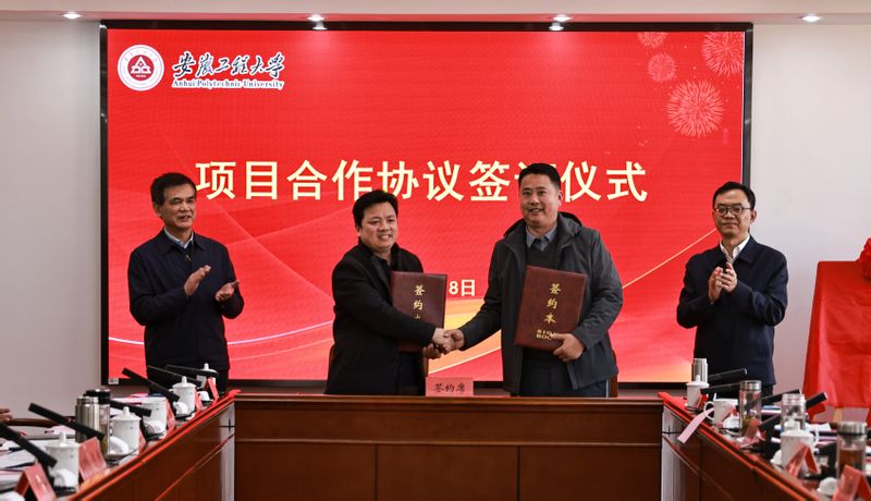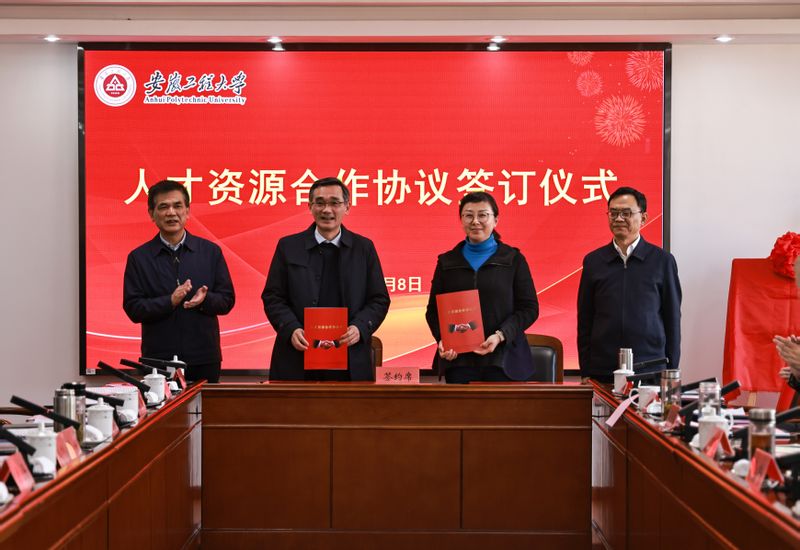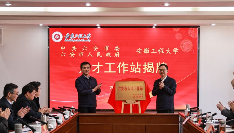 会上,卢平与王红共同为“六安市人才工作站”揭牌,学生处处长黄炜与六安市人社局局长赵锦文代表双方签订人才资源合作协议,人工智能研究院副院长江本赤与安徽正阳机械科技有限公司董事长张为法签订“关键技术研发及产业化项目”科技合作协议。与会成员就干部人才交流、科技成果转化、实习实训等工作展开交流。