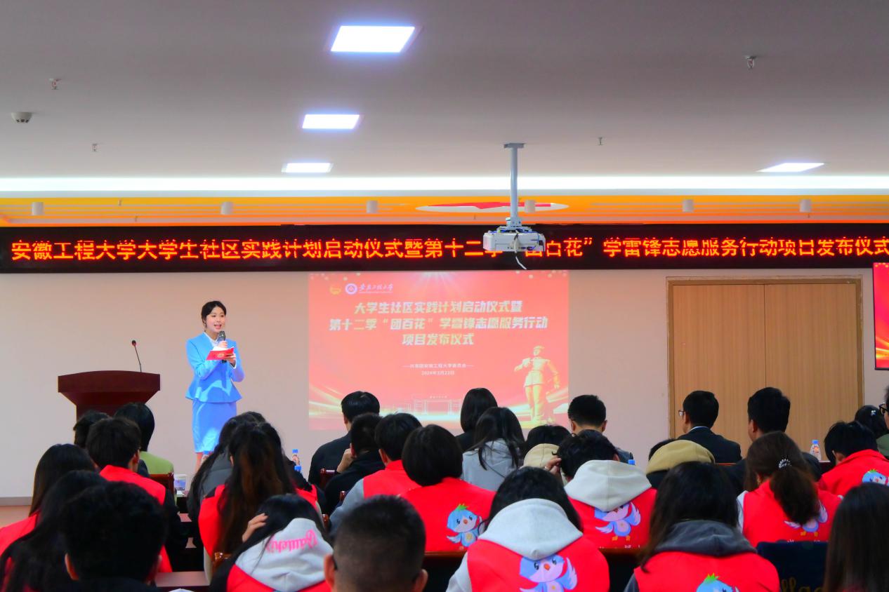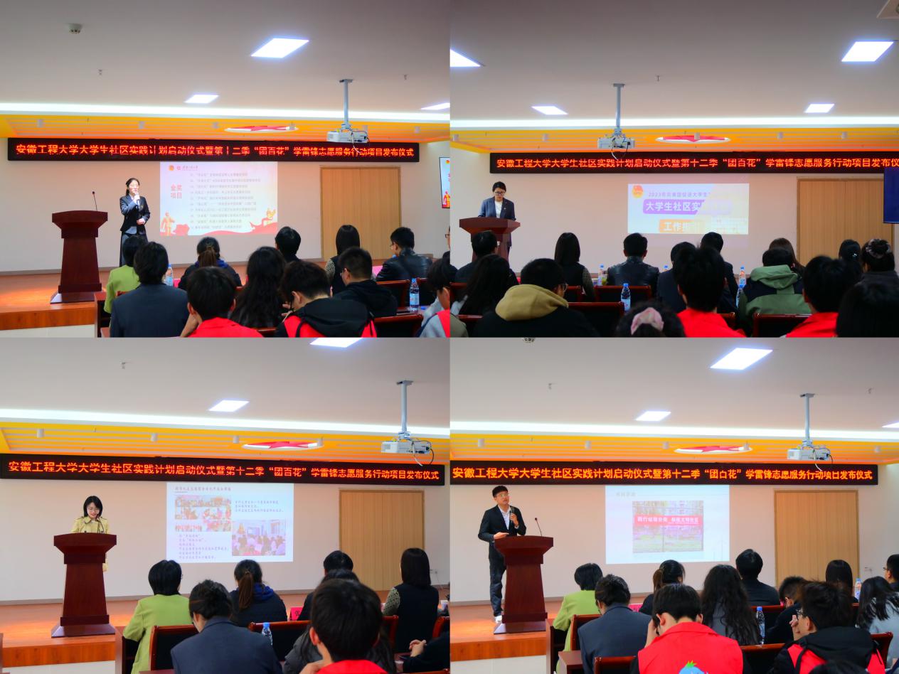 本网讯为贯彻落实习近平总书记关于弘扬雷锋精神的重要论述,扎实推进大学生社区实践计划,3月23日,学校在赭山中路宜邻中心举行大学生社区实践计划启动仪式暨第十二季“团百花”学雷锋志愿服务行动项目发布仪式。团芜湖市委副书记陶涛,镜湖区委常委、宣传部部长杨红,校团委主要负责人,学校组织部、宣传部、教务处、马克思主义学院和镜湖区团委等单位相关负责人,各学院团委负责人,“团百花”学雷锋志愿服务项目负责人,优秀青年志愿者代表,镜湖区相关社区代表参加活动。