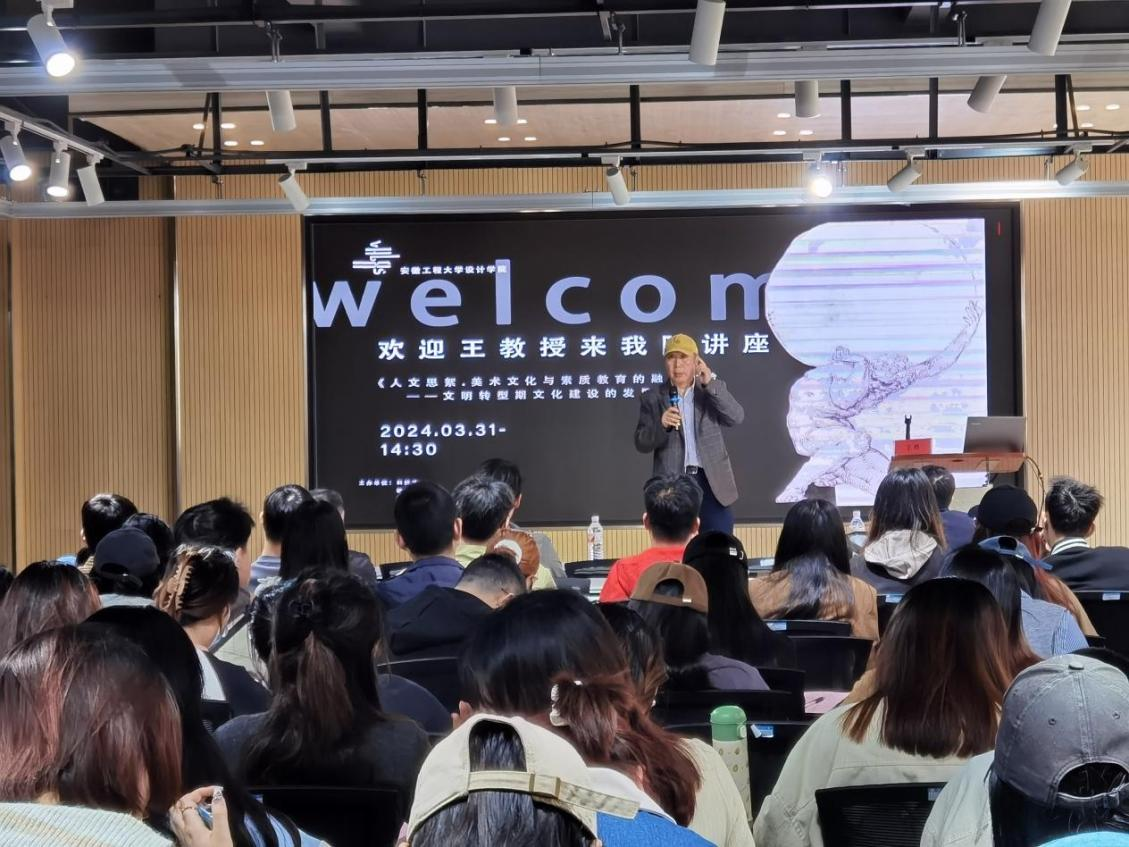 本网讯3月31日,国家一级美术师王勇教授应邀来设计学院做题为“人文思絮:美术文化与素质教育的融合体验——文明转型期文化建设的发展趋势”的学术讲座。本次“设计大讲堂”主题讲座在7教1楼报告厅举行,由设计学院常务副院长张学东主持,设计学院部分教师和研究生参加。
