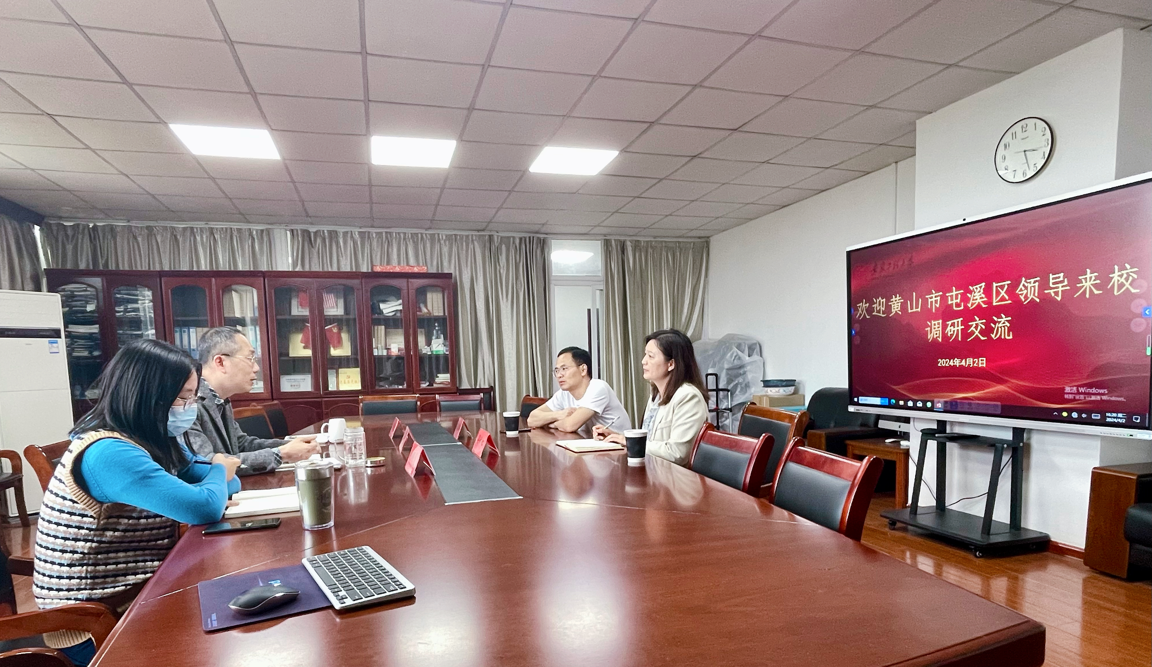 本网讯4月2日,黄山市屯溪区人社局公共就业人才服务中心主任胡建军、屯溪区委组织部吴娇虹来校调研交流国际化工作。国际处(国际教育学院)副处长朱铁军参加座谈会。
