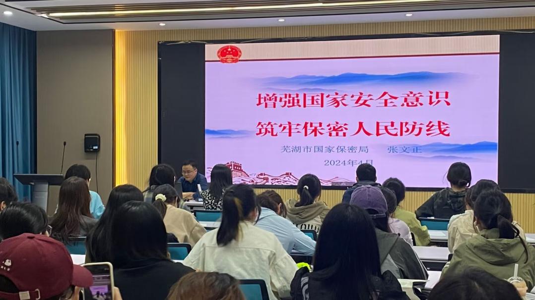本网讯4月15日是第九个“全民国家安全教育日”,当天,学校开展“国家安全 青春挺膺”示范性主题团日活动,邀请芜湖市委办公室保密科科长张文正作专题报告。校团委相关负责人、各学院2023级团支书代表、青马班全体学员参加活动。