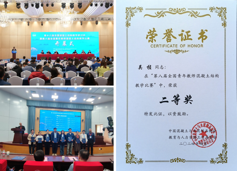 此次全国青年教师混凝土结构教学比赛共有来自59所院校的75名青年教师进行了激烈角逐。各参赛老师运用探究式等教学方式,以娴熟的教学技巧和丰富翔实的教学内容展示了各自的教学风采。我校土木工程系教师吴桢在在教学比赛中表现优秀,荣获二等奖。