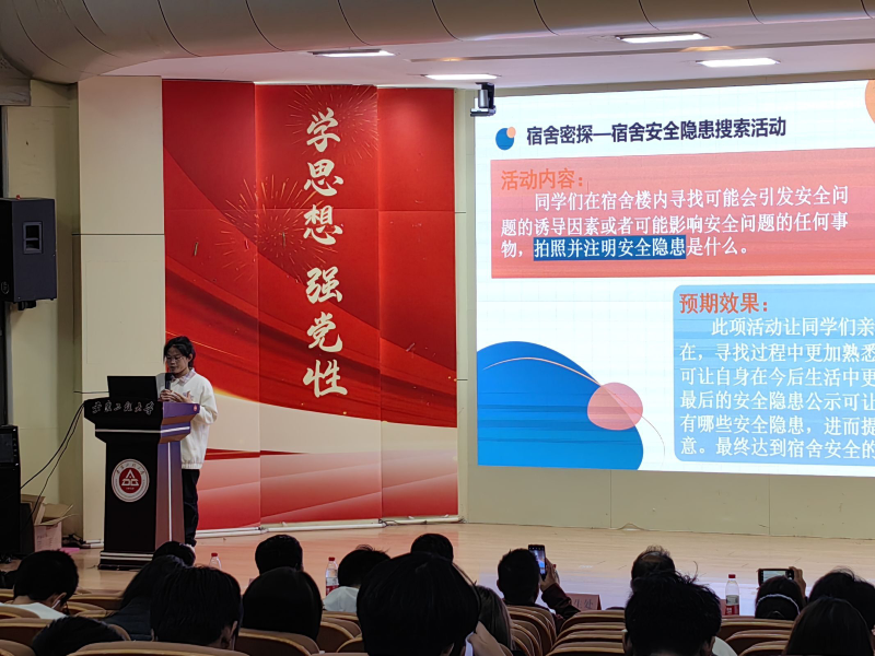 总决赛分为知识竞答和安全提案展示两大环节。第一轮知识竞赛环节包括必答题、抢答题两种形式,内容涵盖宿舍安全、食品安全、消防安全、交通安全、网络安全等多个方面。比赛现场,选手们热情高涨,积极抢答,展现出了非凡的实力与深厚的知识储备。第二轮提案环节中,各组选手们通过PPT演讲的形式,向大家展示了日常生活中发现的校园安全问题并提出了相应的解决方案,为学校安全管理工作建言献策。