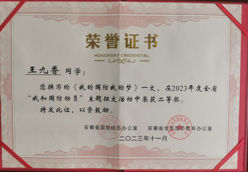 本网讯近日,安徽省国防动员办公室、安徽省全民国防教育办公室组织的“我和国防动员”主题征文活动结果揭晓,我校学生作品从2270篇中稿件中脱颖而出,荣获省级二等奖。