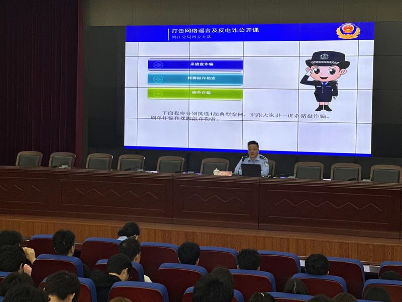 施飞飞通过典型案例,详细讲解了“杀猪盘”诈骗、“裸聊”敲诈勒索、刷单诈骗、游戏类诈骗四种目前高发频发的诈骗类型。通过真实案例,以案说法,深入浅出地讲解了电信网络诈骗的危害性,揭露了电信网络诈骗的犯罪伎俩,分享了自己在案件分析、案件侦破、实施抓捕和审讯嫌疑人过程中的心得体会,提醒在座同学不要贪图小便宜,不要向陌生人透露自己及家人的身份信息、银行卡密码,不要向陌生人转账汇款,不轻信骗子的花言巧语,教育引导大家辨识骗局,提高反诈防骗意识。他指出,网络不是法外之地,务必时刻牢记树立正确的网络安全意识,安全文明上网、谨言慎行,坚决做到不信谣,不传谣,不造谣,自觉抵制网络谣言,共同营造良好的网络环境。