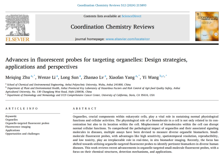 为了从细胞器层面推动荧光探针技术在环境监测与毒理学领域的应用,该团队系统综述了细胞器靶向荧光探针的合理设计、传感性能优化及其在成像领域中的应用,提出了该领域现存的挑战和未来可期的发展方向。细胞器靶向荧光探针为研究人员提供了观察细胞器内部微观环境的新视角,有助于深入理解细胞内生理和环境毒理学过程。这些探针的发展和应用将推动细胞生物学和环境毒理学领域的进步,为未来细胞器层面的生理生态过程和环境毒理机制的研究提供了重要思路。相关成果以“Advances in fluorescent probes for targeting organelles: Design strategies, applications and perspectives”为题在《Coordin. Chem. Rev.》上在线发表。