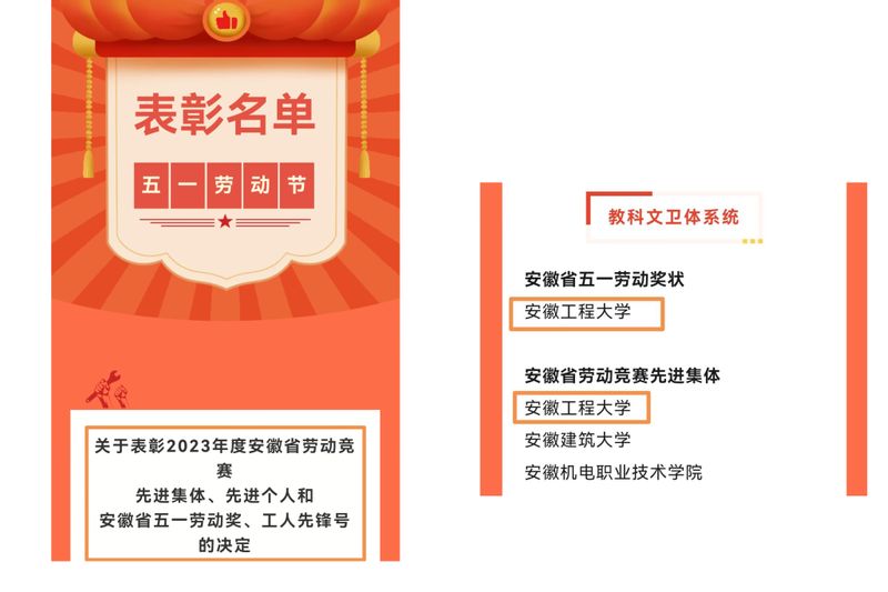 本网讯4月28日,安徽省劳动竞赛委员会、安徽省总工会发布《关于表彰2023年度安徽省劳动竞赛先进集体、先进个人和安徽省五一劳动奖、工人先锋号的决定》。我校荣获“安徽省五一劳动奖状”和“安徽省劳动竞赛先进集体”荣誉称号。