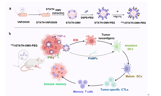 内放射性同位素治疗(RIT)作为临床上治疗肿瘤的重要方法之一,不仅可以直接杀死肿瘤细胞,还能通过诱导肿瘤细胞的免疫原性死亡(ICD)来增强抗肿瘤免疫应答。为了在肿瘤部位实现放射性核素的靶向输送,已经开发了多种生物相容性的纳米载体,以提高治疗效率并最小化副作用。然而,传统的放射性标记纳米载体面临放射标记效率低和肿瘤靶向性差的挑战,这极大地限制了RIT的疗效。近年来,细菌外膜囊泡(OMV)作为一种由革兰氏阴性菌分泌的天然纳米囊泡,在癌症治疗中显示出良好的肿瘤靶向性和作为药物递送载体的潜力。此外,OMV还具有促进免疫细胞分泌干扰素-γ,激活抗肿瘤免疫应答的潜力。