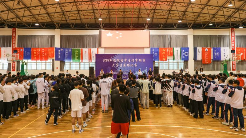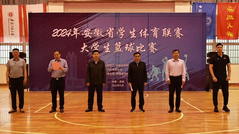 本网讯5月11日,由安徽省教育厅和安徽省体育局主办,学校承办的2024年安徽省学生体育联赛大学生篮球赛(甲组、丙组)在我校体育馆隆重开幕。安徽省教育厅二级巡视员林兴德,校党委常委、副校长郑健出席开幕式。联赛技术官员、裁判员,各代表队领队、教练员和运动员代表参加开幕式。开幕式由安徽省学校体育协会秘书长马纯主持。
