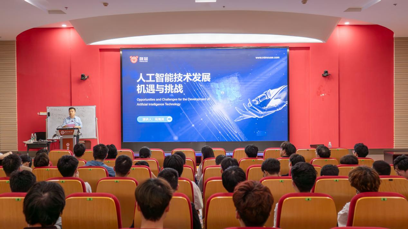 冯海洪从人工智能行业背景开始,结合人工智能领域的典型案例,从产业角度介绍了人工智能核心功能、AI大模型关键节点以及AI发展所面临的挑战和行业趋势。同时以咪鼠科技公司的核心产品智能鼠标为例,分析了智能硬件产品的市场现状、技术优势及未来发展规划。他分享了自己职业生涯的发展历程以及创业的经历,希望将来作为人工智能领域从业者的同学们,在大学阶段就能够找到和确立目标、带着问题去探索和学习,不断地提升工程应用能力。互动环节,冯海洪回答了同学们的提问。