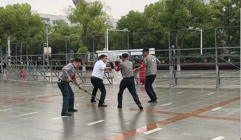活动现场,李圣文及校园为民警务站辅警、安保人员代表就相关防暴器械使用进行了现场实操推演。