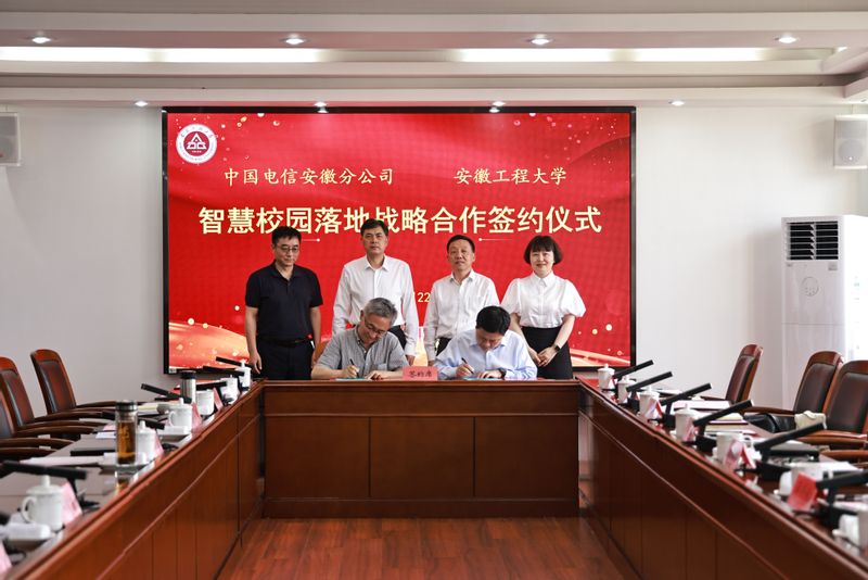 本网讯5月22日,我校与中国电信安徽分公司在A座1215会议室签署智慧校园落地战略合作协议,中国电信芜湖分公司总经理谷开鸿,中国电信安徽分公司教育行业客户部总经理薛燕秋,中国电信芜湖分公司副总经理王大保,校党委书记张志宏,校党委常委、副校长郑健出席签约仪式。办公室、教务处、现代技术中心、国资处、后勤保障处等部门负责人参加。活动由郑健主持。