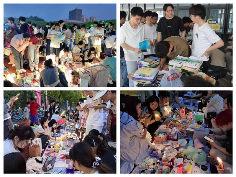 今年的毕业集市设置了五个区域。在“赠人玫瑰 手有余香”旧货交易区,超过200位摊主售卖物品,包括学习资料、电子产品、生活用品、体育用品等,让带不走的青春回忆继续在校园里温暖延续,同学们熙熙攘攘地围在地摊前,热闹非凡;在“爱心传递 公益捐赠”公益捐赠区,本着自愿捐赠、鼓励奉献的原则,同学们将书籍和文体用品捐赠给学弟学妹。在“情系母校 寄语传情”惜别祝福区,毕业生们留下自己的青春感言和毕业寄语,写着祝福语的便利贴和明信片很快贴满了,它们与一旁的鲜花墙交相辉映,祝福所有毕业生前程似锦、一路生花。在“青春飞扬 筑梦启航”表演互动区,相关社团和毕业生带来了精彩的节目表演,吉他演奏、武术表演、街舞、唱歌、走秀等20多个节目吸引着现场的观众,他们用手机亮起闪光灯,打造出一片璀璨的灯海,洋溢着欢乐青春的氛围。“专属定制 独家记忆”手工制作区备受欢迎,开展了非遗漆扇和徽章制作两种手工DIY活动,一把把鲜艳的漆扇、一枚枚精美的徽章,在操场上形成一道道靓丽的风景。