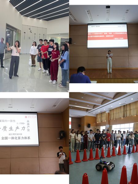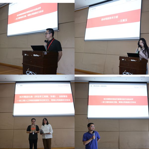 师生来到奇瑞汽车股份有限公司杨子大楼。由智造231团支部陈秀领学党的二十大报告中关于“教育、科技、人才是全面建设社会主义现代化国家的基础性、战略性支撑”、习近平总书记五四青年节对全国广大青年寄语精神。校青年讲师团成员应拔211凌远志带来“青年说创新”《谋新重质 青年何为》主题微宣讲。奇瑞汽车股份有限公司周伟、郭晓卜、王曼玉分别对奇瑞集团-瑶光2025、奇瑞产品开发技术中心底盘、自动驾驶技术等做简要介绍。学生代表束勤及团队向全体人员展示了在第十八届全国大学生智能汽车竞赛的获奖项目Rover X 小车的相关技术运用。