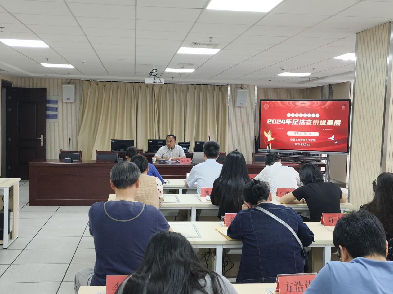 本网讯为深入学习贯彻习近平总书记关于党纪学习教育的重要讲话重要指示批示精神,抓好党纪学习教育,营造崇廉尚廉、遵规守纪的良好氛围,根据学校纪法宣讲进基层工作部署,6月5日,校纪委副书记、纪委办主任郭广春应邀在人文学院教职工政治理论学习会上作纪法宣讲。会议由学院党委书记刘一主持。