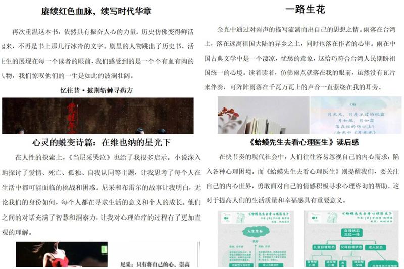 活动为同学们在庸扰与喧嚣中开辟一片宁静闲适的桃花源,在碎片化的快时代觅得一个精神飞地,从中收获平和、吸收养分、汲取智慧,内化为青年学子的热烈情怀。有同学表示:“在这场旅途中我们总能遇到一颗丰盛的心灵,与它共鸣,感受到内心的充盈;总能走进一个未曾抵达的世界,历经真实的悲喜,获得力量。”“《被讨厌的勇气》告诉我所谓的自由,就是被别人讨厌。我们不必在别人的指点下规划自己的人生蓝图,也不必在人际关系里陷入如履薄冰的怪圈,挣脱掉那所谓的枷锁,与不完美的自己和解,你有多可爱,你的世界便有多可爱。”
