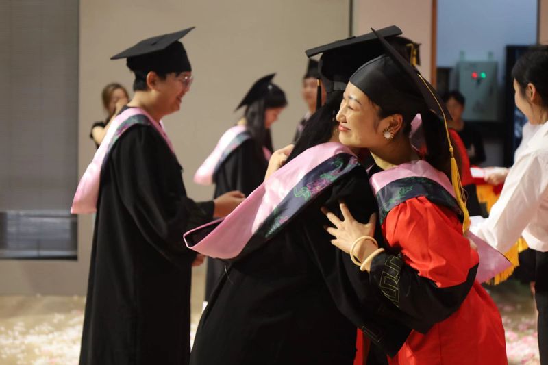 胡好代表全院师生祝福毕业生,他对大家在校期间的勤奋学习和刻苦实践表示肯定,对大家在专业赛事、文体活动、志愿服务等比赛和活动中取得的成绩表示赞扬,这些都充分展示了“雨耕勤作 赤铸精工”的大学精神和“尚德敏学 唯实惟新”的校训。对于未来,他希望全体毕业生要树立远大理想,争做新时代的有志青年;要自觉崇德向善,争做新时代的有品青年;要矢志艰苦奋斗,争做新时代的有为青年。胡好、金庆红、薛保红、杜静歌共同为毕业生扶正流苏并合影留念。