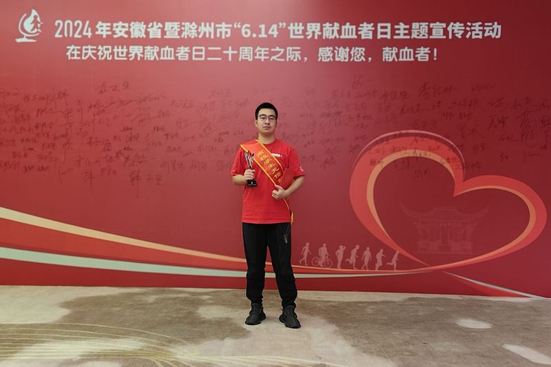 本网讯在庆祝世界献血者日二十周年之际,6月12日,安徽省卫生健康委员会、安徽省红十字会等8家单位联合主办“安徽省2024年无偿献血公益之星与先进集体评选活动”。我校生物与食品工程学院生物工程专业王建韬同学荣获“安徽省2024年高校学生无偿献血先进个人”荣誉称号。