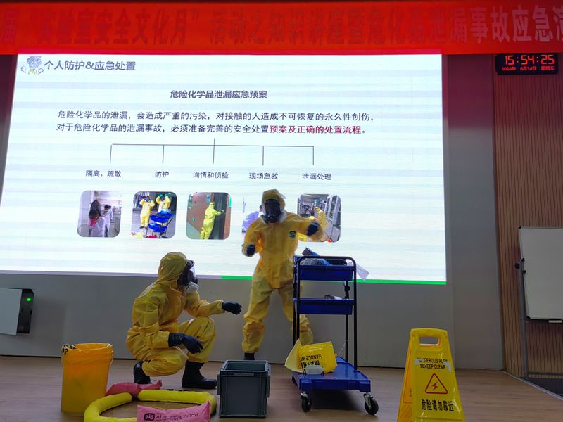 受邀专家作“实验室安全及典型事故案例解读”知识讲座,通过近几年典型的实验室安全事故案例向大家阐述了实验室安全风险意识的重要性,详细讲解了如何预防实验室事故,包括对实验室安全管理的严格要求、实验操作规程的遵守、个人防护用品的正确使用等。活动现场,进行了一场模拟浓盐酸试剂泄漏的实验室安全事故应急实景演练,志愿者在现场模拟安全事故的发生和应急处置措施的实施,帮助师生“沉浸式”学习和掌握自救、互救技能。