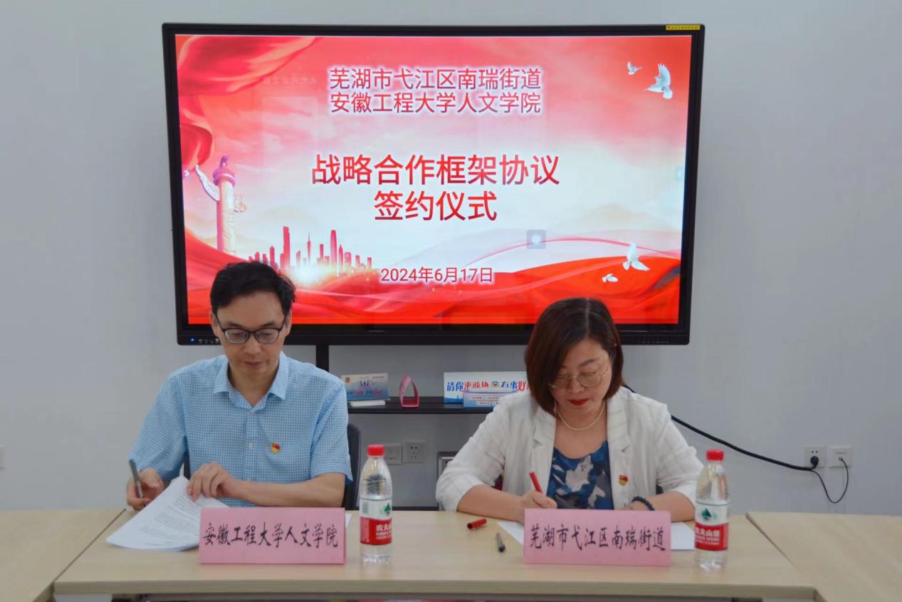本网讯6月17日,人文学院与芜湖市弋江区南瑞街道战略合作框架协议签约仪式在南瑞街道党群服务中心四楼会议室举行。人文学院院长刘军与南瑞街道党工委书记孙亚敏代表双方签署协议,仪式由南瑞街道党工委副书记谢欢欢主持。
