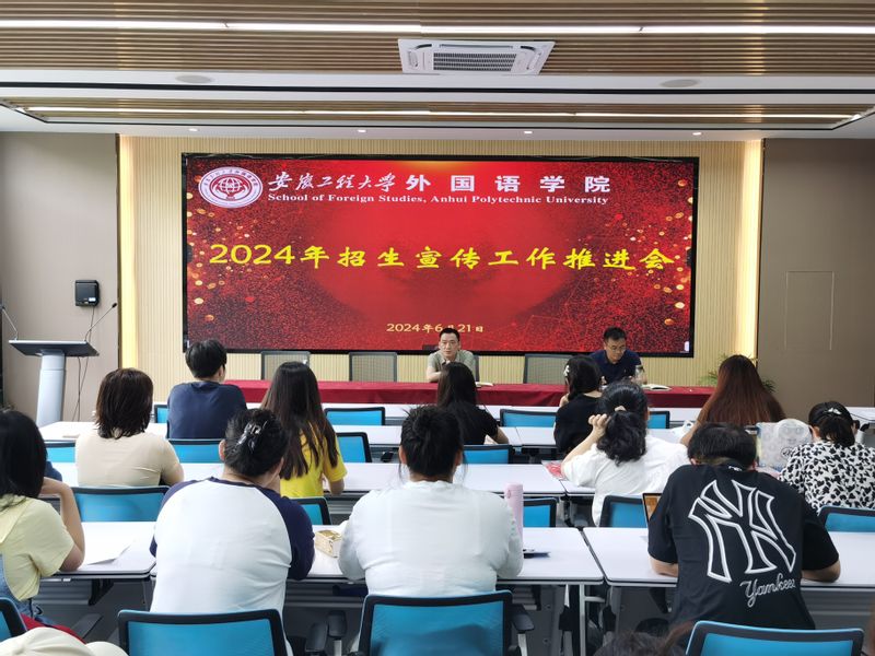 本网讯6月21日,外国语学院在9J209会议室召开招生宣传工作推进会,学院党委书记董金权、副院长李新国,参加招生咨询会及招生宣传的教师和学生参加了会议。