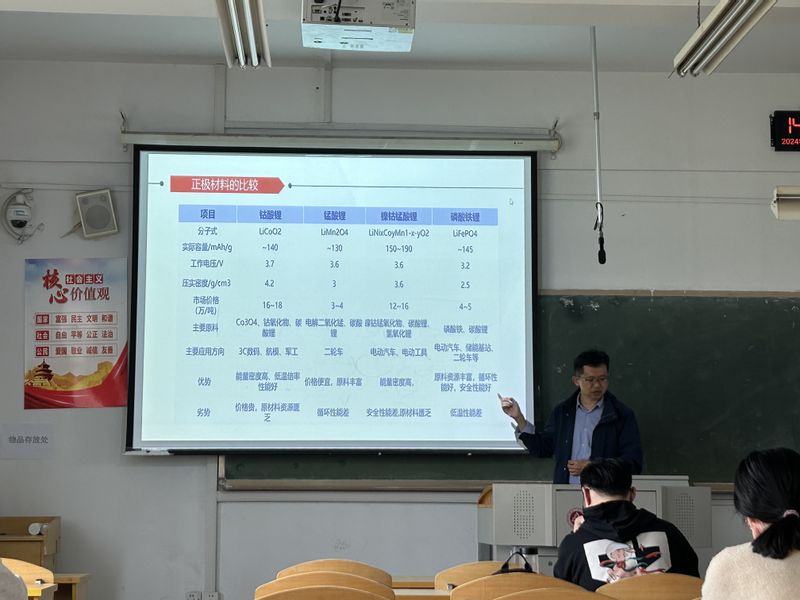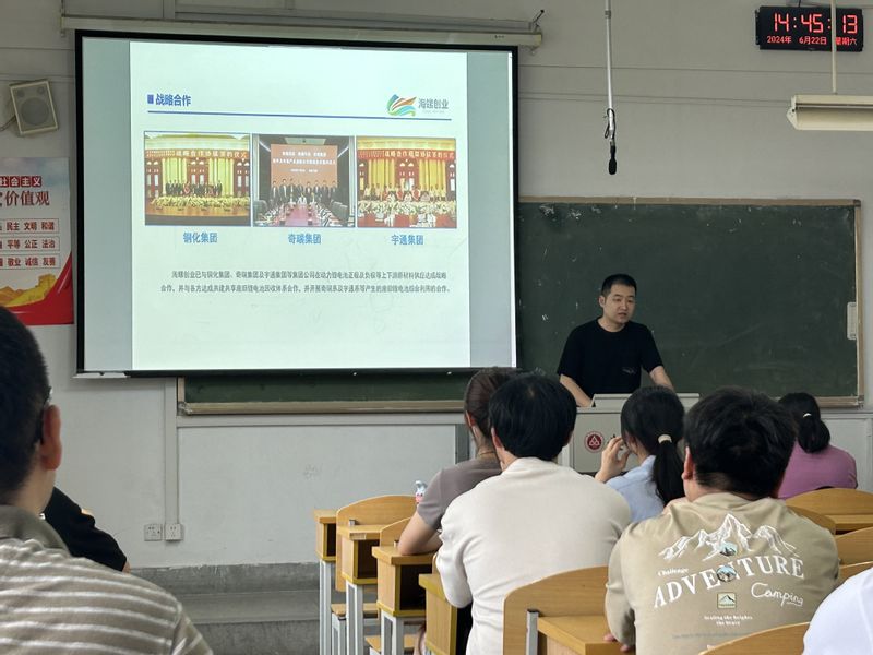 在讲座中,盖腾助理以“新能源材料技术和质量要求”为题,深入剖析了新能源材料技术的前沿进展和严格的质量标准。他结合海创新能源在研发锂离子电池正极材料方面的实际案例,让学生们对理论知识在实际工作中的应用有了更直观的认识,并培养了他们解决实际问题的能力。李洋部长则围绕“废旧锂离子电池回收与再利用”的主题,介绍了电池回收的重要性和当前的技术挑战,激发了学生们对环保和可持续发展的关注。