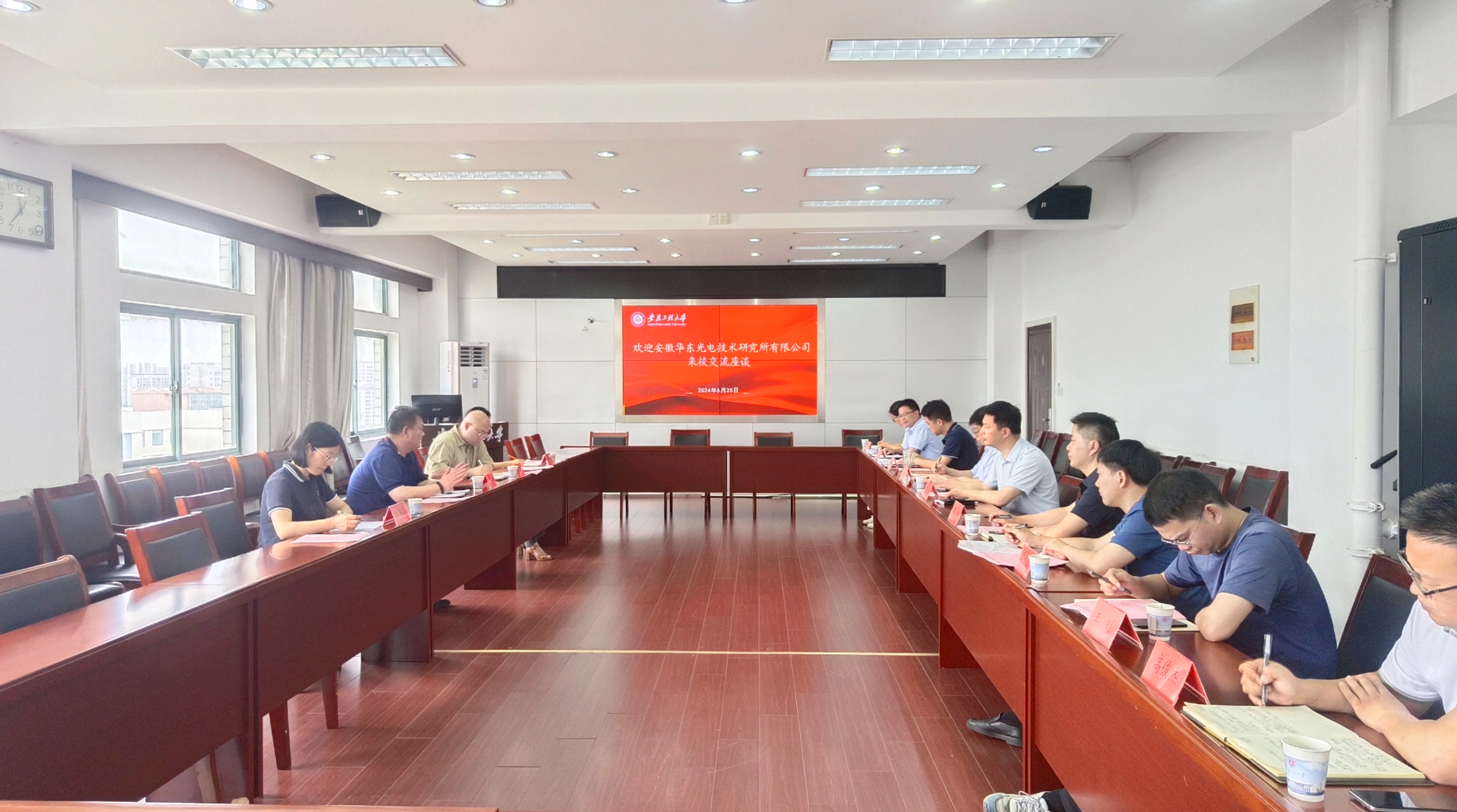 本网讯6月25日,安徽华东光电技术研究所有限公司党委副书记费文军一行来校就深化合作进行洽谈交流。校党委常委、副校长凤权出席会议。学校卓越工程师学院(奇瑞学院)、科技处、教务处、人事处、学生处相关负责人参加会议。会议由科技处副处长(主持工作)王宗乾主持。