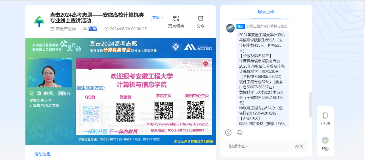 本网讯6月26日,计算机与信息学院受邀参加由安徽省计算机学会、安徽省人工智能学会共同主办的“直击2024高考志愿——安徽高校计算机类专业院长线上宣讲活动”,教学副院长刘涛代表学院进行了直播宣讲,副书记孙德茹、院长助理严楠及相关教师对考生和家长的疑问进行解答,省内外考生和家长近9200人观看了直播。