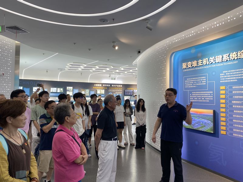 师生在中国科学院等离子体物理研究所工会主席刘学田、副主席程艳,三室主任吴亚楠和合肥物质科学研究院博士生导师杜华的陪同下,先后参观了等离子体所、聚变创新展览馆,近距离参观托卡马克核聚变实验装置,全面了解“人造小太阳”。