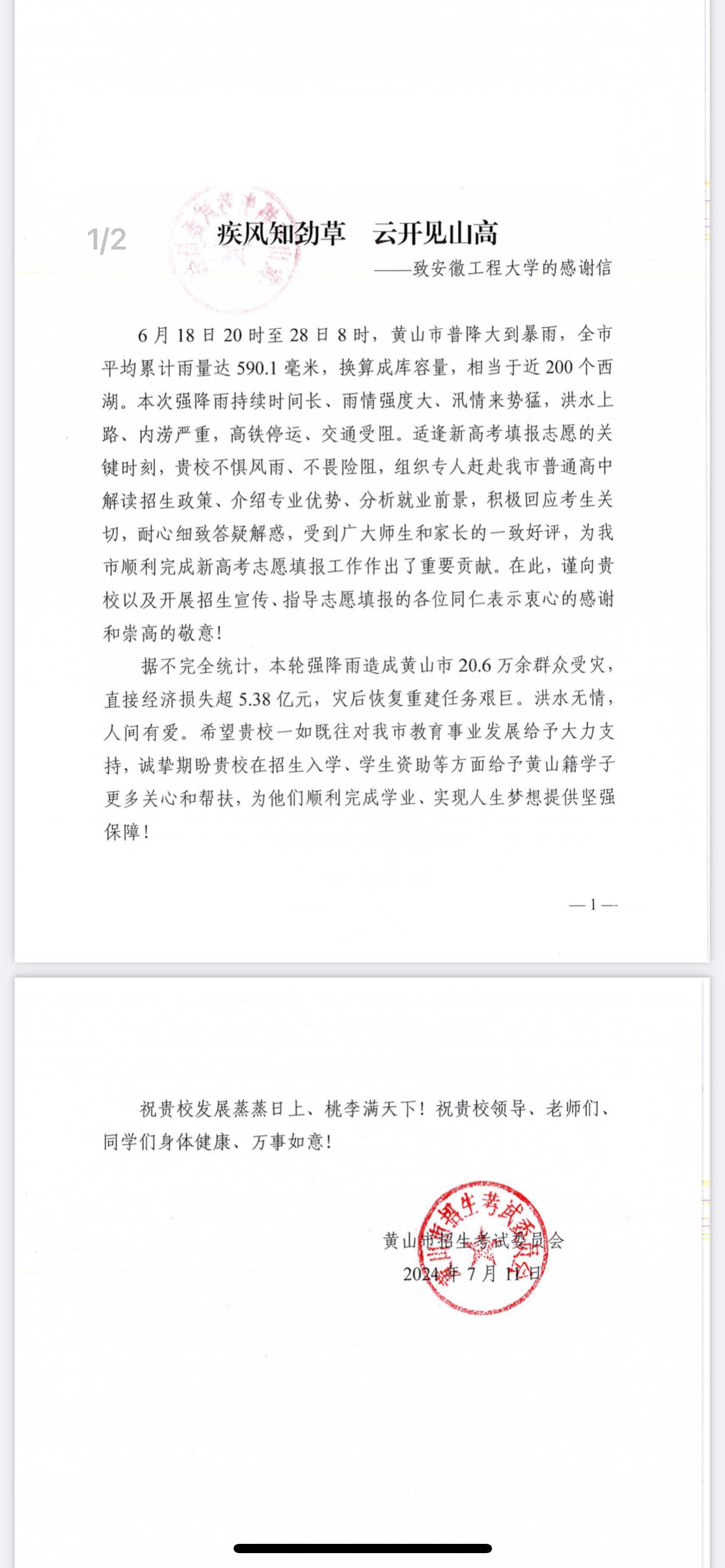 本网讯7月11日,学校收到黄山市招生考试委员会发来的《疾风知劲草 云开见山高——致RayBetApp官网下载 的感谢信》,充分肯定了我校黄山市招生宣传工作组的工作成果并对学校表示感谢。
