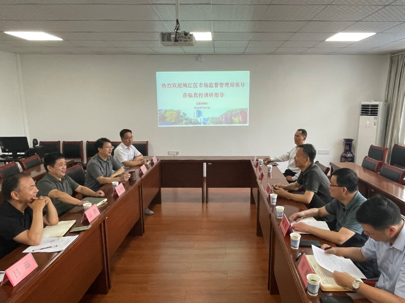 本网讯7月17日,芜湖市鸠江区市场监督管理局局长曹立群一行五人来我校调研食堂食材采购与分析智慧监管系统运行情况,后勤党总支书记张开炳、后勤保障处处长李敬华、副处长高潮、膳食服务中心工作人员及部分食堂负责人参加了交流会。