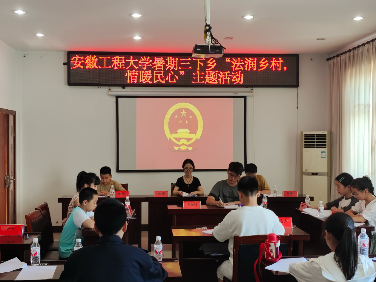 “法情乡韵”模拟法庭三下乡团队自组建以来,积极联系地方团委、联合地方律所,结合地方民情开展“法润乡村,情暖民心”系列活动。在宣城市广德市誓节镇开展普法活动期间,团队成员们通过开展线下走访宣传、读书分享会、模拟法庭等方式开展青少年普法教育活动,使小朋友们直观地了解案件的审判流程和法庭纪律,推进法治教育从“被动灌输”变为“主动接受”。