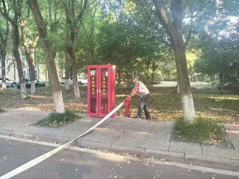 保卫处结合校园目前的安全形势,制定了详细的演练预案。把安保力量分成三个灭火小组,每个小组分工明确、责任到人。随着指挥员下达演练开始的指令,七人组成的灭火救援组开展了水带铺设和预备干粉灭火器扑救环节,另外三人组成的疏散救援小组开始把火场周边的易燃物品进行搬运、隔离。待现场人员全部到达指定位置和120米水带铺设完成后,指挥员再次下达“出水”指令,一条水龙喷射而出。经过5分钟紧张有序的扑救,火灾被成功扑灭,此次演练顺利完成。